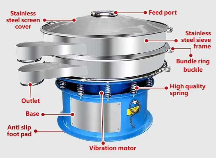 Feldspar powder particles are fine and easily agglomerate, easily clogging the screen surface during screening. The Feldspar powder vibrating screen offers several advantages in this regard. It utilizes the principle of rotary vibration to make materials undergo planar swirling motion on the screen surface, rapidly breaking down and classifying feldspar powder, significantly improving screening throughput. The entire device has a closed structure, ensuring minimal dust escape during screening, maintaining a clean operating environment and reducing feldspar powder waste. Screen replacement is also convenient; the tensioning device is ergonomically designed, allowing operators to quickly change screens or clean the screen surface, minimizing downtime and labor intensity. Furthermore, the circular rotary vibrating screen is small, lightweight, easy to move, consumes little power, operates quietly, and requires no complex foundation, making it ideal for flexible integration into existing feldspar powder production lines. It can operate as a standalone unit or be connected in series to form an automated screening system, improving overall production efficiency while reducing operational complexity.
