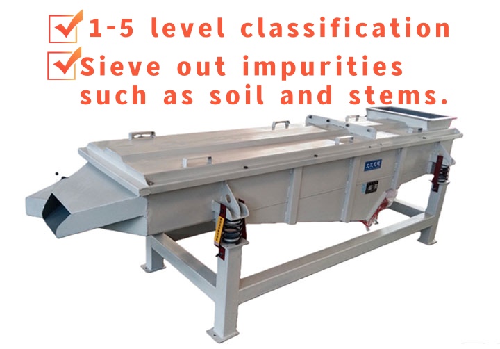 The Peanut vibrating screen can be equipped with 1-5 layers of screens to separate peanuts according to particle size, such as classifying peanuts into different grades or sorting peanut kernels according to plumpness and size specifications.